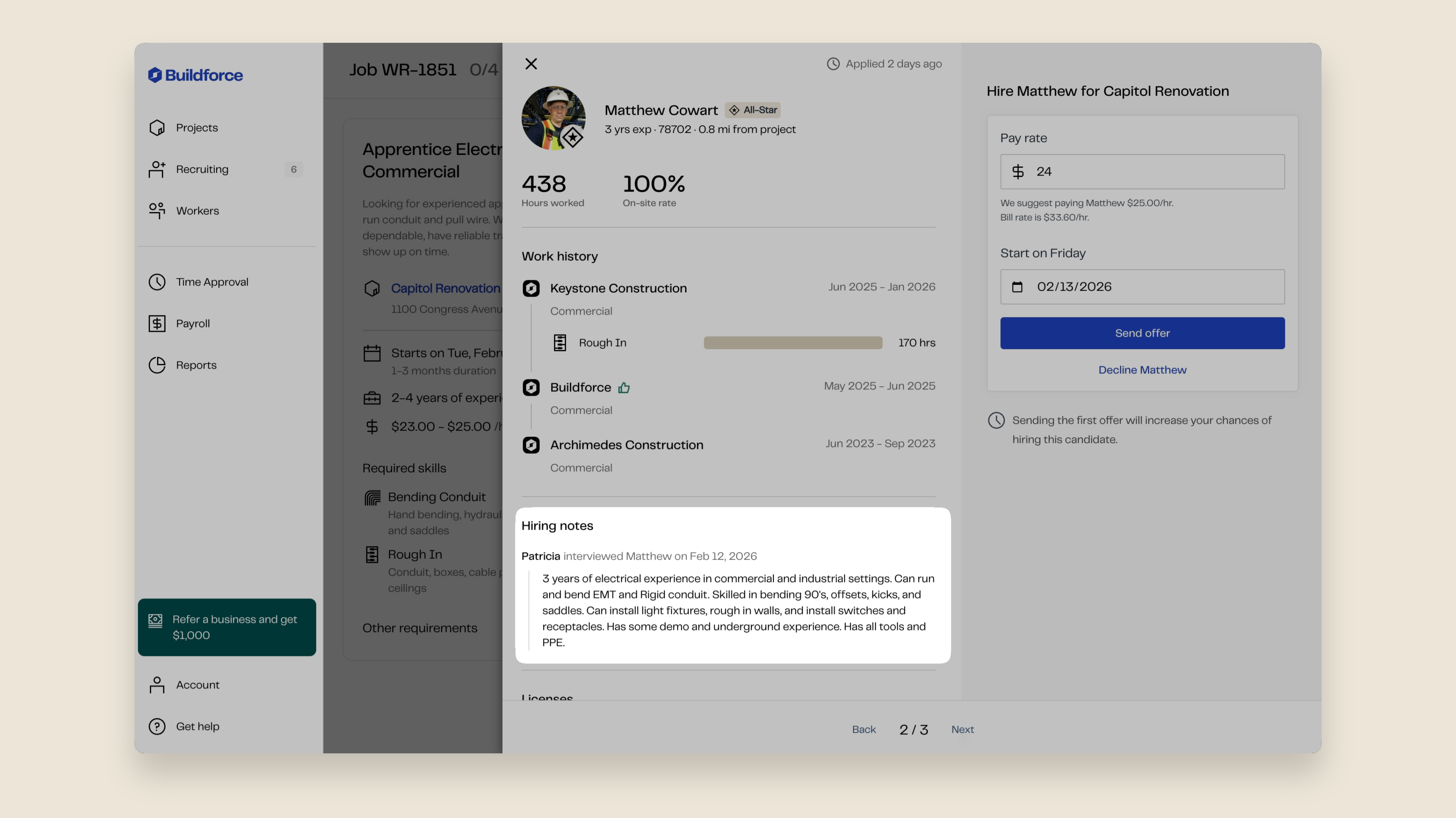 Interview Notes — For electricians new to Buildforce, interview notes and their last 3 employers now appear directly in the applicant view. For electricians with Buildforce experience, their performance data takes priority.